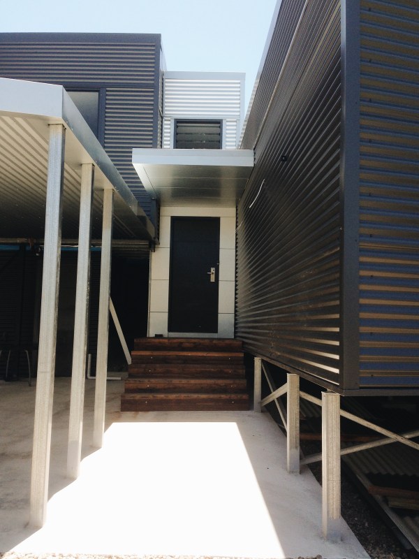 The contrasting colours of the Monument and Zincalume work very well together and have been well received by neighbours and passer-by’s alike. The recycled timber floor boards used for the windows screens and the recycled timber wall studs used for the entry stairs provide a softer rustic element compared to the linear crisp finish of the colorbond.